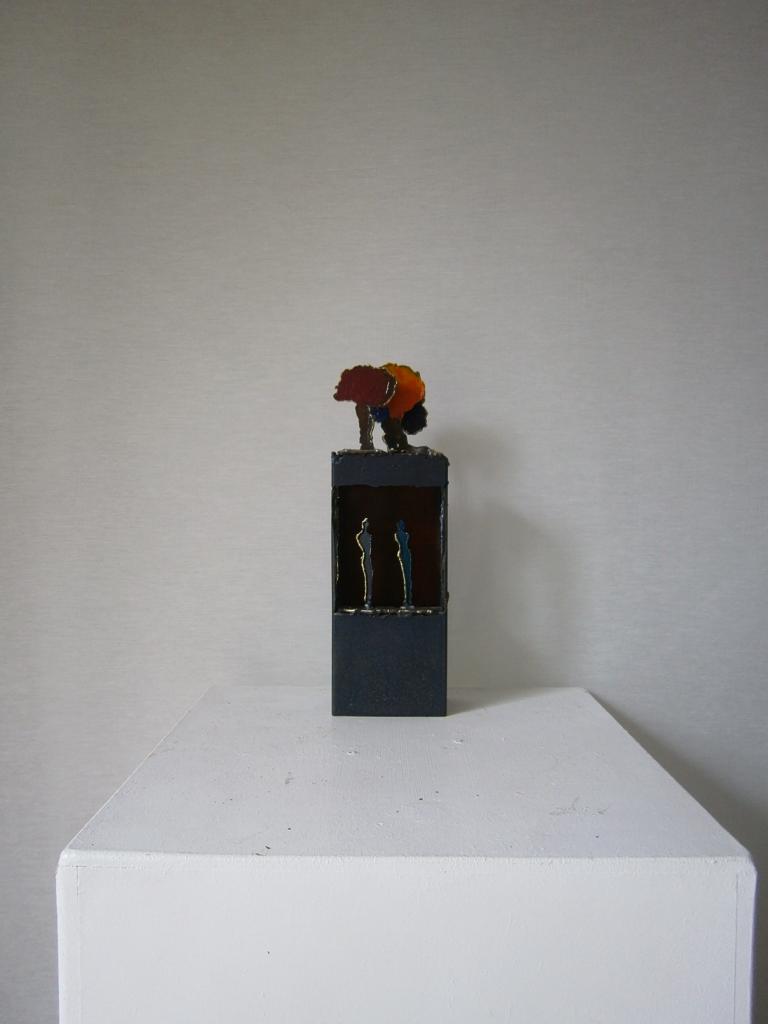 arbres rouges et personnages en métal